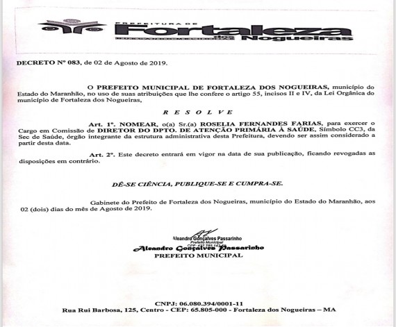 A Prefeitura Municipal de Fortaleza dos Nogueiras nomeia a Senhora ROSELIA FERNANDES FARIAS para...