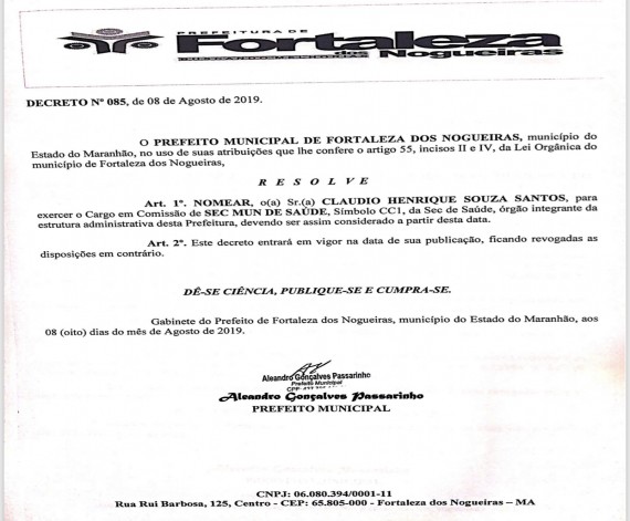 A Prefeitura Municipal de Fortaleza dos Nogueiras nomeia o Senhor CLAUDIO HENRIQUE SOUZA SANTOS par...