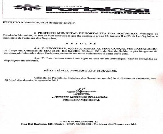 A Prefeitura Municipal de Fortaleza dos Nogueiras exonera a Senhora MARIA ALVINA GONÇALVES PASSARIN...