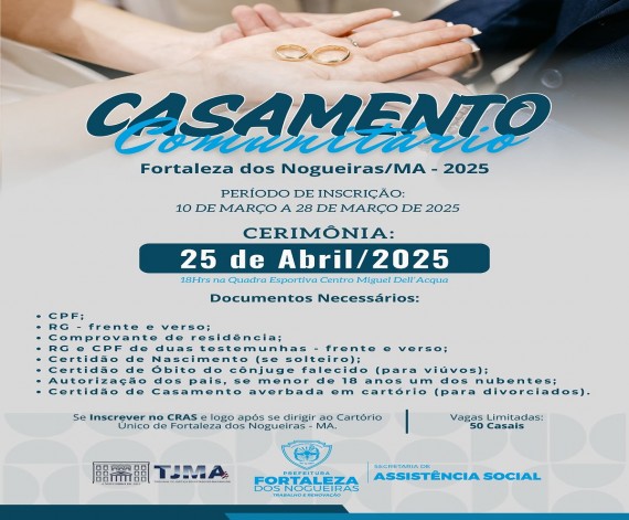 O amor está no ar em Fortaleza dos Nogueiras! Vem aí o Casamento Comunitário 2025, uma oportunidade...