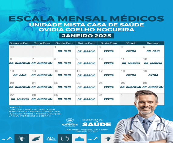 Confira a escala mensal de médicos da Unidade Mista Casa de Saúde Ovidia Coelho Nogueira para o mês...