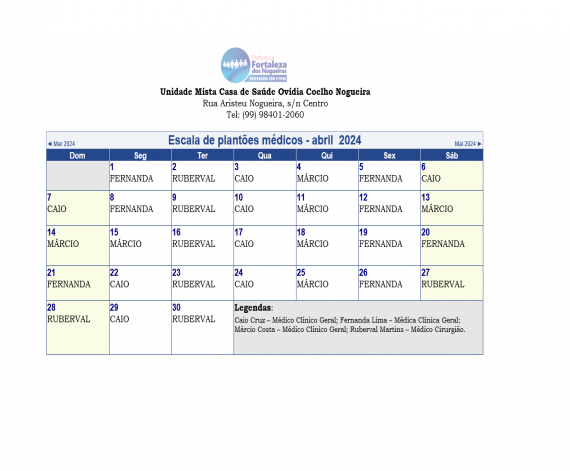 Escala dos plantões médicos do mês de abril de 2024, da Unidade Mista Casa de Saúde Ovídia Coelho No...