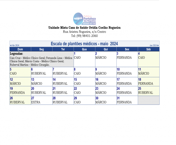 Escala dos plantões médicos do mês de maio de 2024, da Unidade Mista Casa de Saúde Ovídia Coelho Nog...