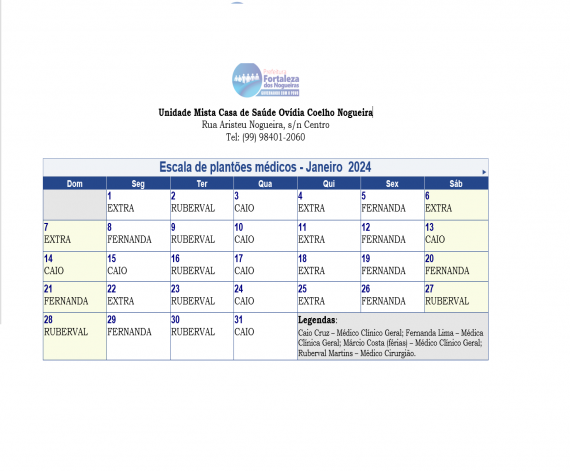 Escala dos plantões médicos do mês de janeiro de 2024, da Unidade Mista Casa de Saúde Ovídia Coelho ...