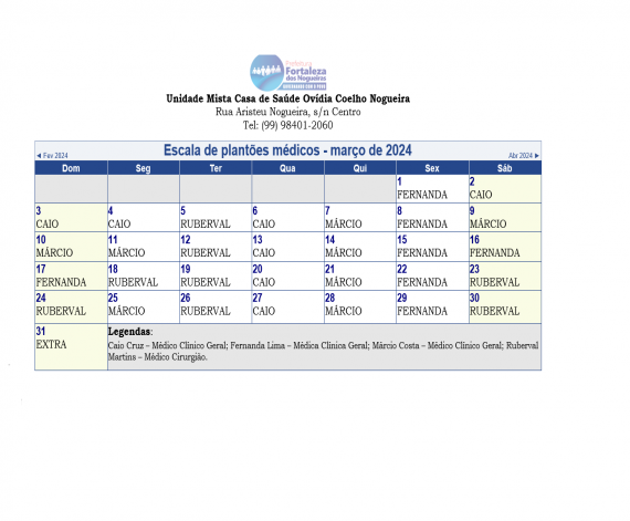 Escala dos plantões médicos do mês de março de 2024: UMCS Ovídia Coelho Nogueira