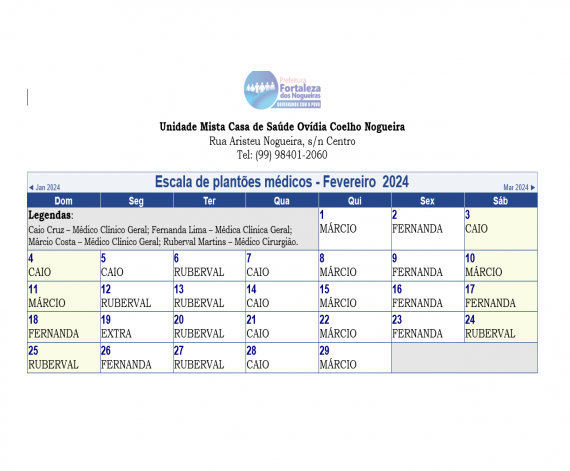 Escala dos plantões médicos do mês de fevereiro de 2024, da Unidade Mista Casa de Saúde Ovídia Coelh...