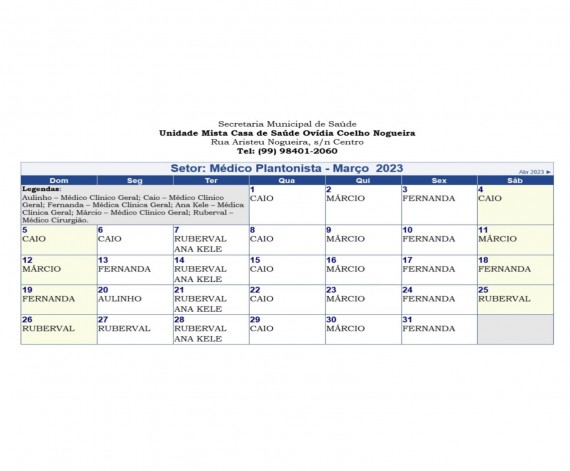 Escala dos plantões médicos do mês de março de 2023, da Unidade Mista Casa de Saúde Ovídia Coelho No...