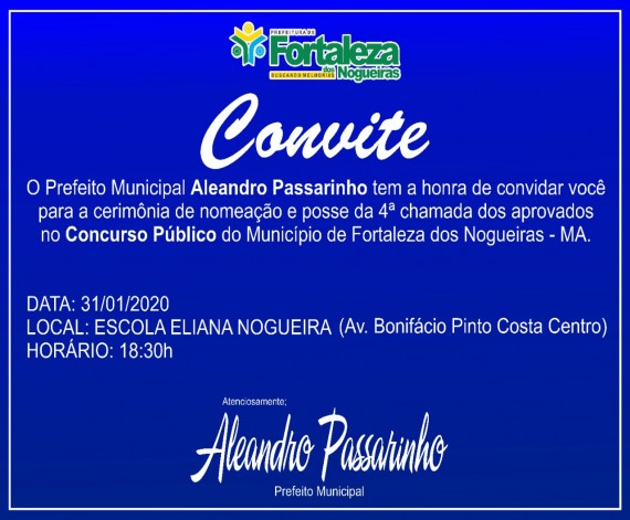 O Prefeito Municipal Aleandro Passarinho tem a honra de convidar-los, para a cerimônia de nomeaçao e...