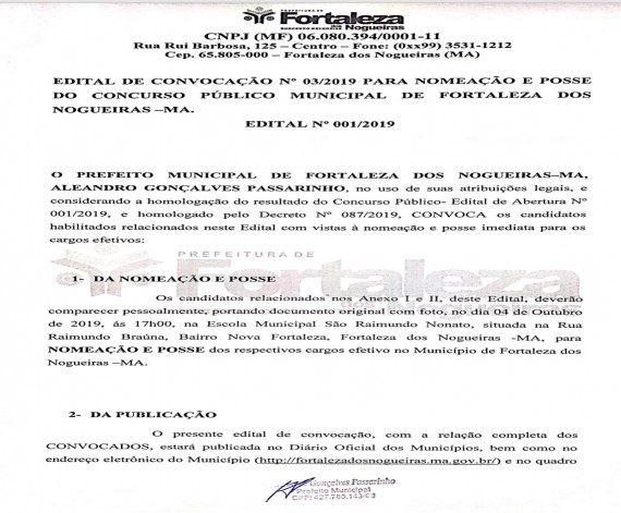 EDITAL DE CONVOCAÇÃO 03/2019 PARA NOMEAÇÃO E POSSE DO CONCURSO PÚBLICO MUNICIPAL DE FORTALEZA DOS NO...