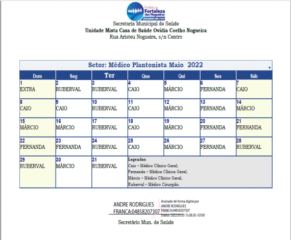 Escala dos plantões médicos do mês de maio de 2022, da Unidade Mista Casa de Saúde Ovídia Coelho Nog...