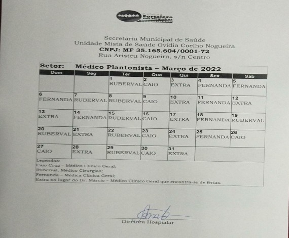Escala dos plantões médicos do mês de março de 2022, da Unidade Mista de Saúde Ovídia C. Nogueira.\n...