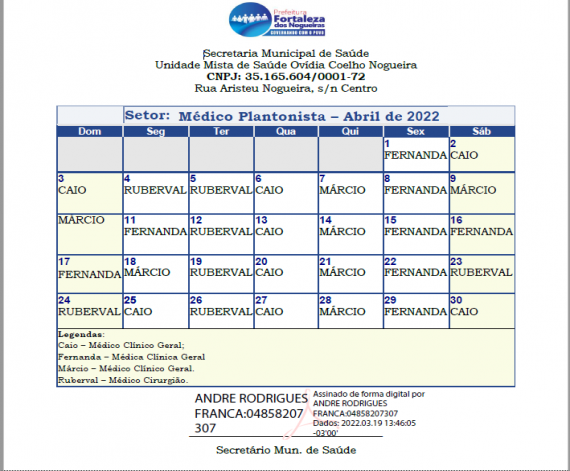 Escala dos plantões médicos do mês de abril de 2022, da Unidade Mista Casa de Saúde Ovídia Coelho No...