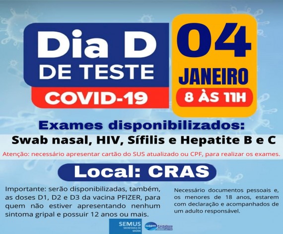 A Secretaria Municipal de Saúde irá promover, no dia 04 de janeiro de 2022, o primeiro mutirão de te...