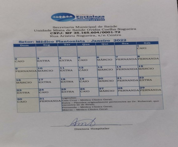 Escala dos plantões médicos do mês de janeiro de 2022, da Unidade Mista de Saúde Ovídia C. Nogueira....