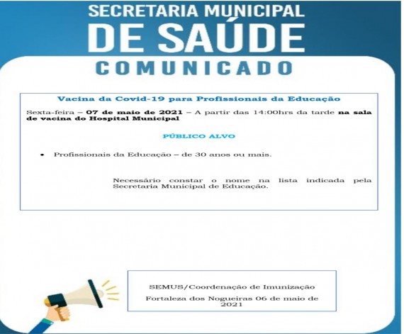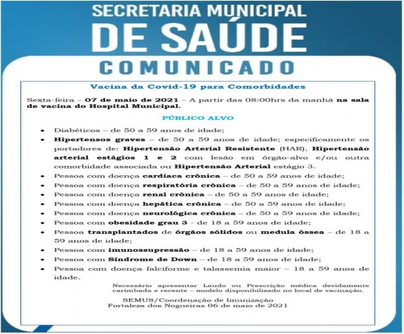 Início da Capanha de Vacinaçao da Covid-19 para pessoas com Comorbidades. Na sexta-feira, 07 de maio...
