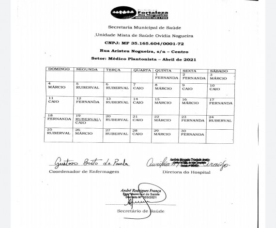 Escala dos plantões médicos do mês de abril, da Unidade Mista de Saúde Ovídia C. Nogueira.